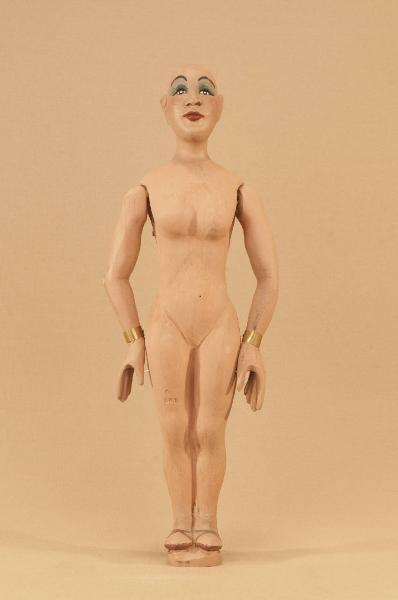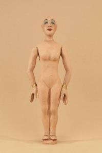 Marionetta in legno di tiglio che ha mobili solo le braccia. Bracciali in ottone ai polsi.