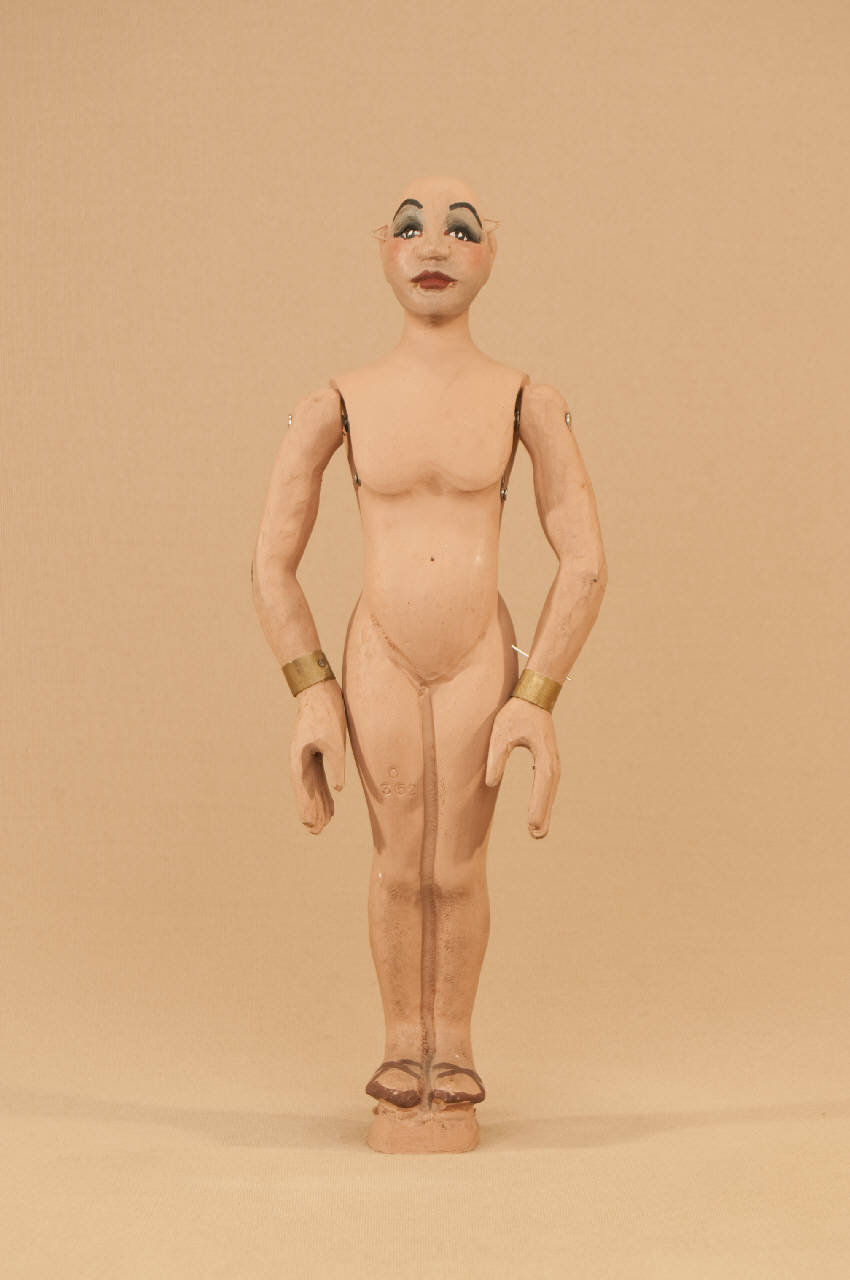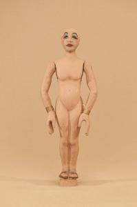 Marionetta in legno di tiglio che ha mobili solo le braccia. Bracciali in ottone ai polsi.