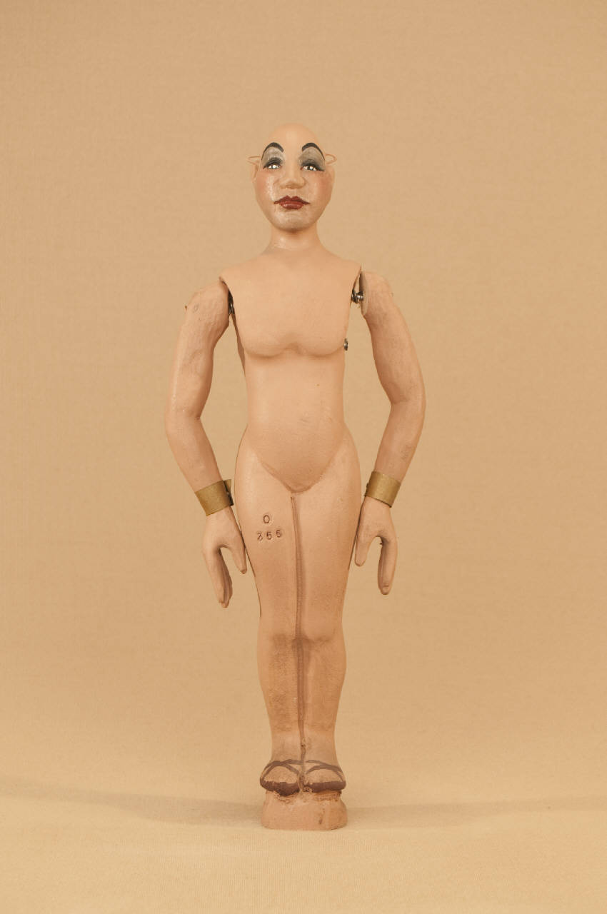 Marionetta in legno di tiglio che ha mobili solo le braccia. Bracciali in ottone ai polsi.
