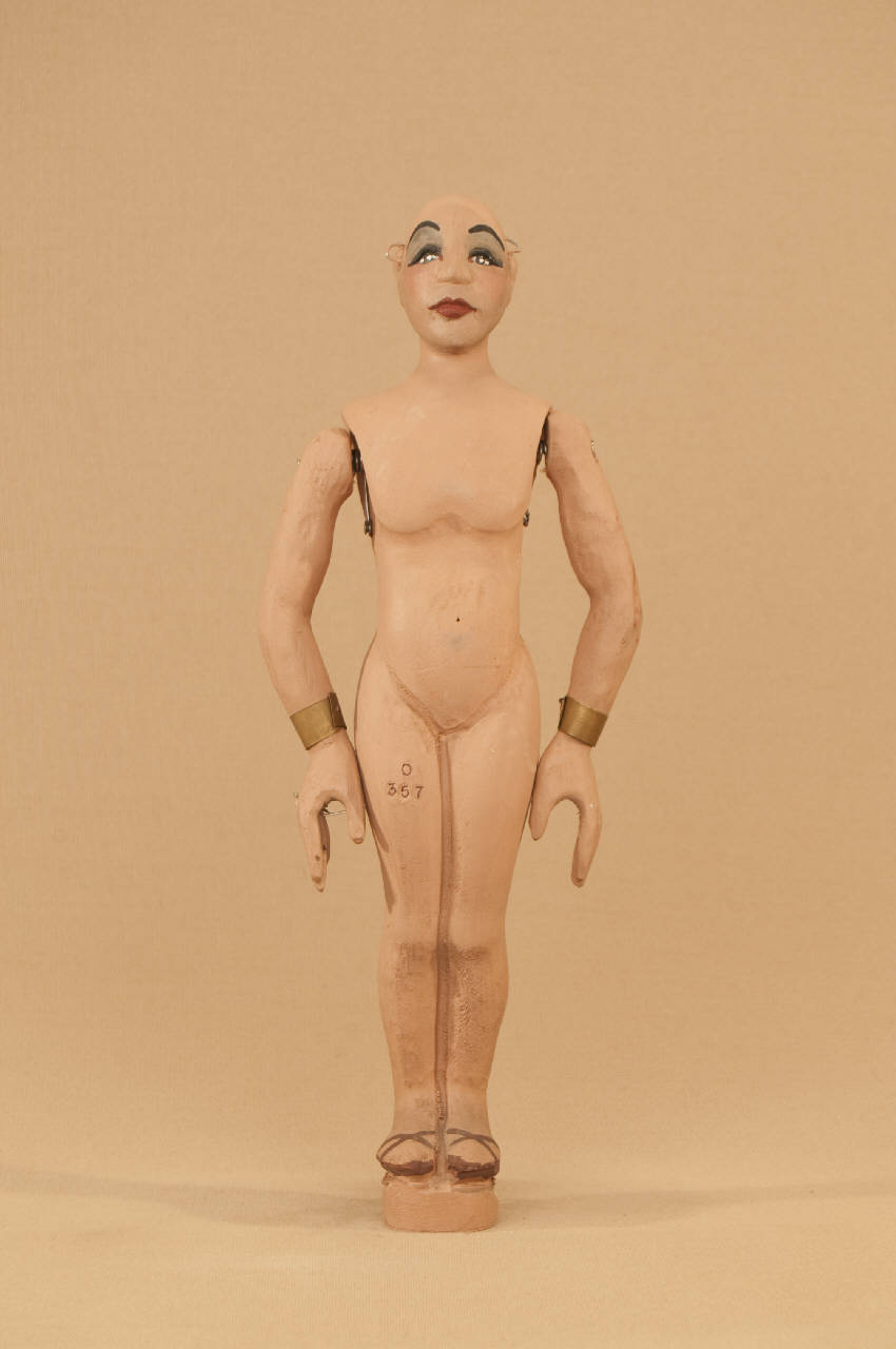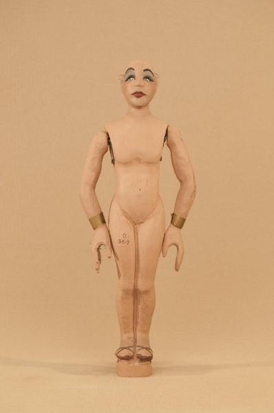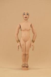 Marionetta in legno di tiglio che ha mobili solo le braccia. Bracciali in ottone ai polsi.