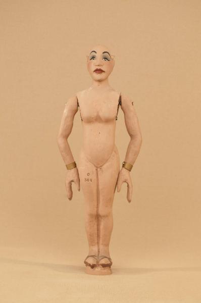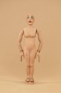 Marionetta in legno di tiglio che ha mobili solo le braccia. Bracciali in ottone ai polsi.