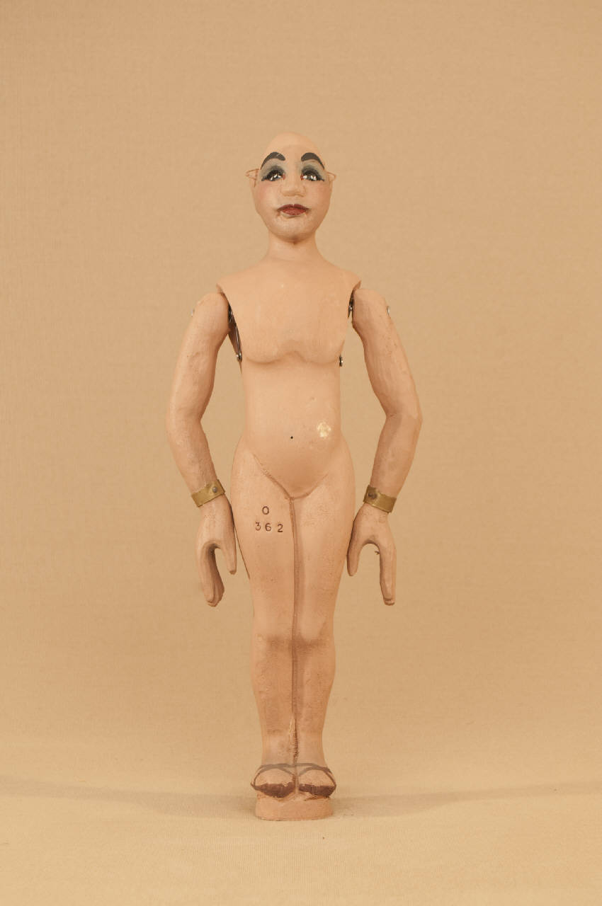 Marionetta in legno di tiglio che ha mobili solo le braccia. Bracciali in ottone ai polsi.