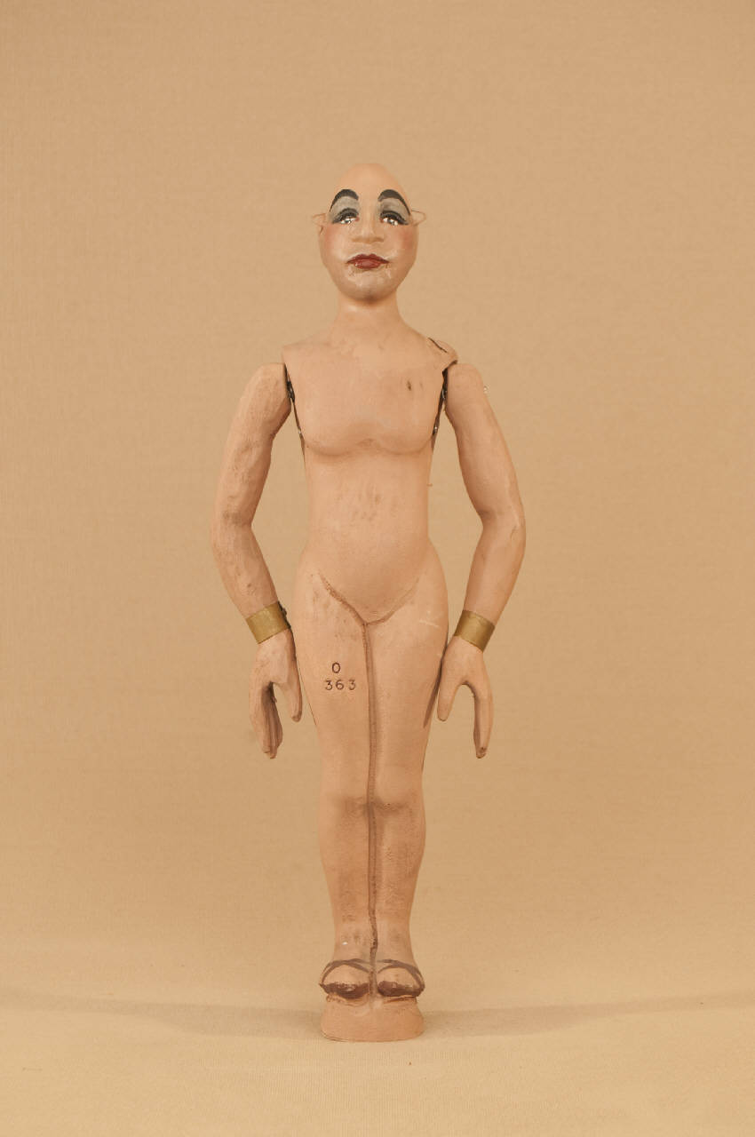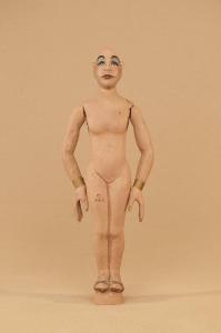 Marionetta in legno di tiglio che ha mobili solo le braccia. Bracciali in ottone ai polsi.