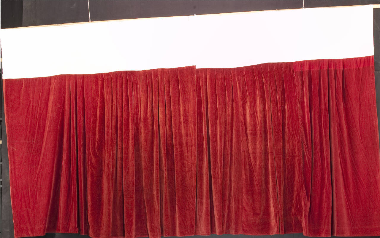Sipario composto da due falde in velluto di cotone rosso da 300 g. al mq., confezionate con una fascia di tela di cotone bianco da 200 g. al mq. Meccanismo di apertura tramite tiranti diagonali in filo di nylon ritorto passanti in anelli metallici cuciti sul retro del tessuto.