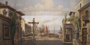 - NOTIZIE STORICO CRITICHE Scenografia realizzata per l'allestimento dello spettacolo. "Cristoforo Colombo" è stato scritto da Carlo II Colla nel 1898 a Biella, con scene di Leone Mens e musica del maestro Levis Ramella. Si tratta del terzo kolossal con duecento personaggi del repertorio della Compagnia Marionettistica Carlo Colla e Figli che segue "Excelsior" e "Il giro del mondo in ottanta giorni", a celebrare il progresso e l'uomo di età positivista. Lo sviluppo drammaturgico segue le tappe fondamentali dell'impresa del navigatore genovese utilizzando la formula del ballo si Scuola Scaligera ed alterna parti mimate parti danzate. Nel 1948 fu realizzata una versione cinematografica dello spettacolo. L'azione teatrale di Carlo II Colla segue l'impresa del navigatore genovese dal suo arrivo al Convento di S. Maria della Rabida, alla discussione del suo progetto di circumnavigazione con i dotti dell'Università di Salamanca sino alla richiesta di protezione fatta ai sovrani a Santa Fè durante l'assedio della città di Granada. L'intercessione della regina Isabella fa sì che la spedizione possa salpare dal porto di Palos. Lo spettacolo proseguiva con l'ammutinamento dei marinai, lo sbarco sull'isola di Guanahani sino al rientro in Spagna di Colombo per subire un processo. La concezione ottocentesca in cui era nato lo spettacolo prevedeva che al protagonista morente si offrisse la visione della gloria futura. Nel 1992, da una coproduzione con il Teatro alla Scala, nacque un nuovo allestimento che univa a questa azione mimica, alcune parti cantate dell'opera di Franchetti.