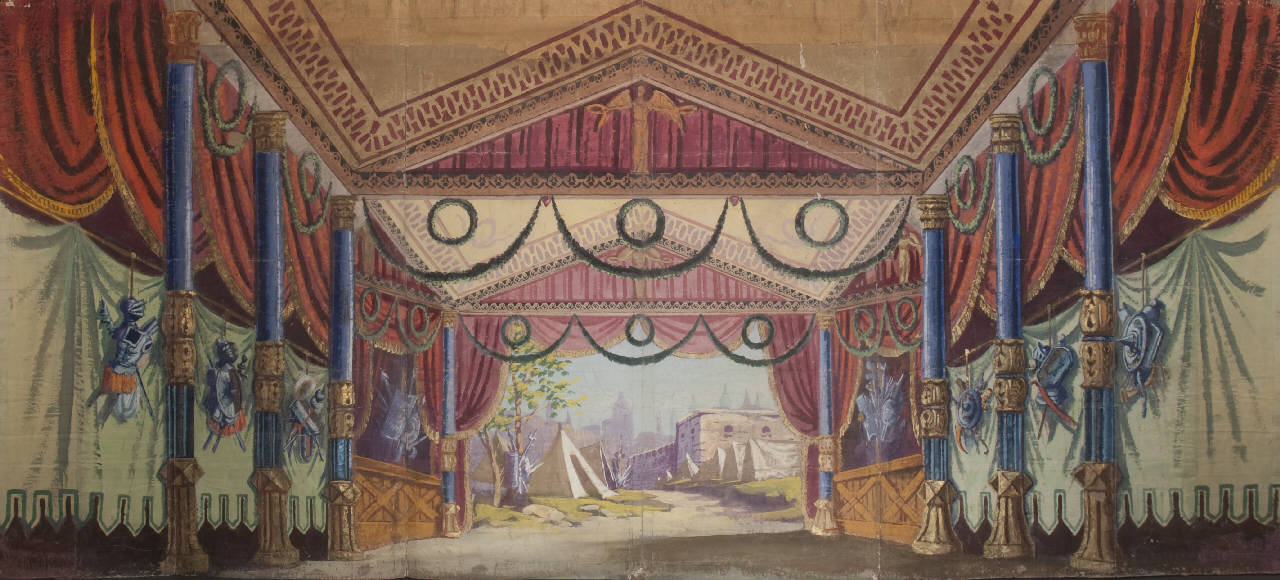 Scenografia composta da un solo fondale. Supporto in carta porosa 80 g. al mq. di colore écrue liscia da 80 g. al mq. di colore paglierino dipinta con colori ad acqua e fortezzata lungo i perimetri e le linee di piegatura con strisce in tela di cotone di diverse grammature.