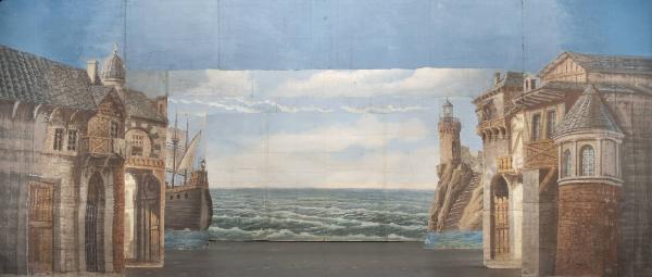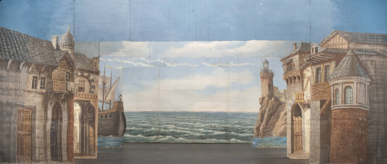 Scenografia composta da tre principali ed un fondale. Supporto in carta porosa 80 g. al mq. di colore écru e liscia da 80 g. al mq. di colore paglierino dipinta con colori ad acqua e fortezzata lungo i perimetri e le linee di piegatura con strisce in tela di cotone di diverse grammature. Allunghi recenti in carta siling avana extra da 80 g. al mq.