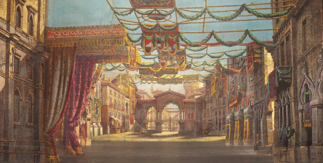 Scenografia composta da un fondale e tre principali. Supporto in carta porosa 80 g. al mq. di colore écru e liscia da 80 g. al mq. di colore paglierino dipinta con colori ad acqua e fortezzata lungo i perimetri e le linee di piegatura con strisce in tela di cotone di diverse grammature. Allunghi recenti in carta siling avana extra da 80 g. al mq.