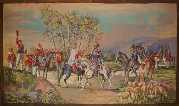 - NOTIZIE STORICO CRITICHE Il sipario veniva utilizzato come comodino. Fu realizzato per lo spettacolo dal titolo originale "L¿eroe dei due mondi, ovvero Garibaldi e i suoi tempi", epopea storico militare appartenente al repertorio storico della Compagnia Marionettistica Carlo Colla e Figli, fu rappresentato per la prima volta al Teatro Gerolamo di Milano nel 1932, in occasione del cinquantesimo anniversario della morte di Giuseppe Garibaldi.\nLa trama ripercorre le vicende della vita dell¿Eroe dei Due Mondi, da Nizza a Genova, dal Sudamerica a Roma e alla Sicilia, fino al ritiro a Caprera. Al di là del "medaglione" storico di carattere didascalico danno vita all¿azione drammaturgia i diversi personaggi nella loro funzione di commento corale. Ad essi si unisce il personaggio di Gerolamo, secondo la tradizione del teatro marionettistico che vuole la presenza del personaggio maschera a "commentare" le gesta dei grandi personaggi facendosi intermediario fra le azioni dell¿eroe indomito, la vita quotidiana del popolo e lo spettatore.\nL¿allestimento dello spettacolo in occasione delle celebrazioni di Garibaldi nel 2007 prevede l¿utilizzo di scenografie, marionette e costumi tratti dal repertorio storico e appartenenti all¿edizione del 1932, unitamente a materiali realizzati ad hoc per la nuova edizione a integrazione e/o sostituzione del materiale storico.\nLe musiche per lo spettacolo, scritte appositamente per questa nuova edizione sono del maestro Giuseppe Azzarelli.