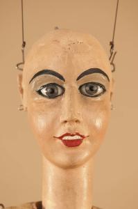 Testa di legno di tiglio fissata al corpo tramite ferro, occhi di vetro. Corpo normale in abete. Gambe unite al bacino tramite bordione in ferro in modo che si aprano lateralmente, ginocchia mobili con linguetta in acciaio. Braccia e mani in tiglio con dita scolpite e separate. Piedi mobili. Bilancino metodo Holden per ballerini.