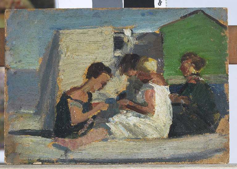 - NOTIZIE STORICO CRITICHE Affascinato dalla coesione della scena, il pittore cattura rapidissimo il gruppo di donne dedite al ricamo e accomodate davanti al blocco unitario dei capanni. L'urgenza della stesura deposita tocchi intrisi di colori diversi e lascia scoperto il supporto che contribuisce alla definizione dei contorni delle figure (Boletti, 2007, p. 104).