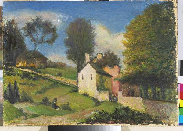 - NOTIZIE STORICO CRITICHE Con la vecchiaia la consunta tavolozza di Pasinetti rifiorisce in una gamma di cromie sfavillanti che crea motivi tersi come in questo scorcio della Val Vigezzo, l'ultima impressione dal vero dipinta dall'artista. L'energia dei colori dunque non si smorza con l'avanzamento in età del pittore, anzi si potenzia, tanto che l'impiego di azzurri e di verdi così vivaci crea un'atmosfera idealizzata percorsa di buonumore (Boletti, 2007, p. 123).
