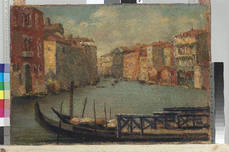 - NOTIZIE STORICO CRITICHE Il pratico formato della tavola consente al pittore di fermare en plein air un suggestivo scorcio di Venezia, catturando con freschezza il cielo limpido ed i continui riverberi di una giornata di sole in laguna.