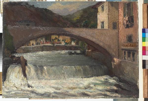 - NOTIZIE STORICO CRITICHE Rispetto al bozzetto svolto in ambiente (Inv. PPMTA00106), Antonio Pasinetti arricchisce la tavolozza di colori e toni amplificando gli effetti del salto dell'acqua.