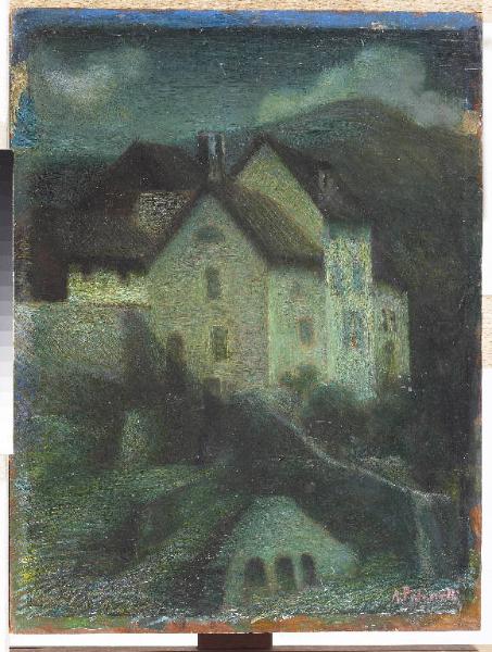 - NOTIZIE STORICO CRITICHE Antonio Pasinetti si confronta con il tema di un paesaggio notturno a Craveggia (Bergamo), in cui la stratificazione pittorica su toni ribassati ed i guizzi del pennello dettano la composizione. Così, il segno diviso, dona alla scena un carattere vibrante che rischiara il borgo nella notte.