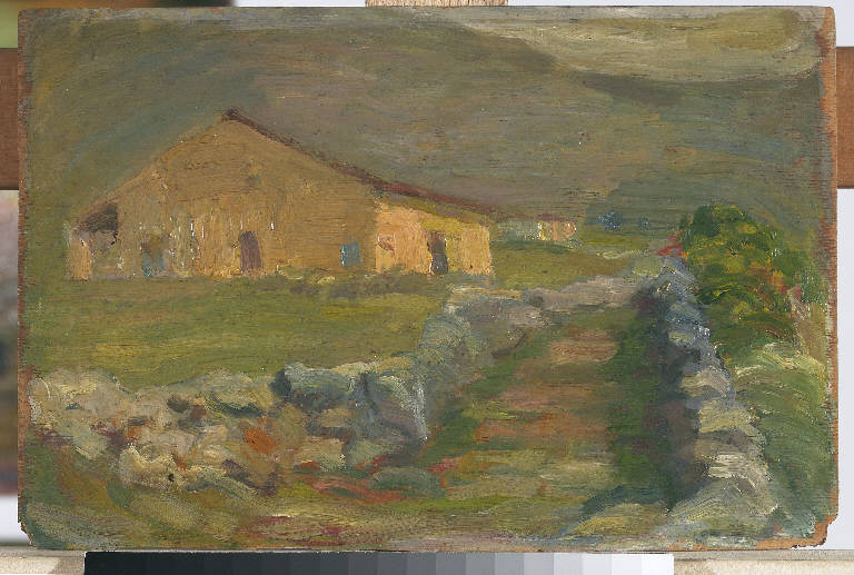 - NOTIZIE STORICO CRITICHE Antonio Pasinetti compone il dipinto con gli elementi essenziali della baita e del viottolo, lasciando emergere i calibrati tratti del pennello e i colori declinati in numerose tonalità.