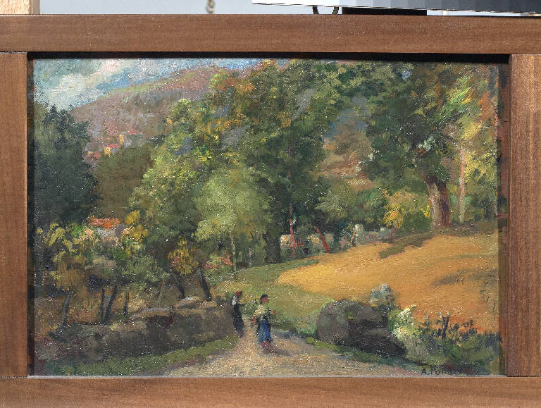 - NOTIZIE STORICO CRITICHE L'elemento descrittivo delle figure in primo piano e delle abitazioni risulta secondario allo studio libero, ma meticoloso, delle tonalità del verde e dell'ocra che caratterizzano il dipinto.