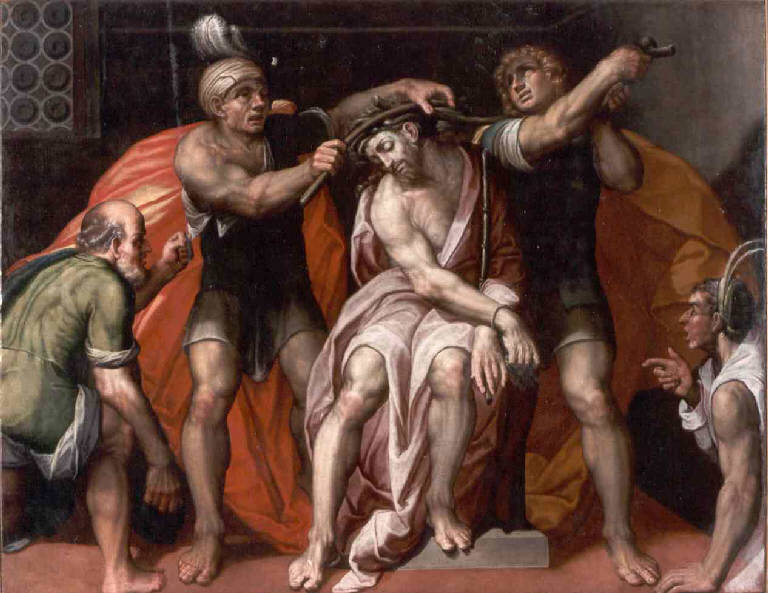 A sinistra due personaggi maschili, uno ritratto di tre quarti, piegato e con il pugno destro alzato, e uno in piedi visto frontalmente mentre intreccia sul capo di Cristo i rami di rovo, aiutato da un altro uomo in piedi sulla destra del dipinto. Nell'angolo in basso a destra, personaggio maschile di tre quarti, seduto a terra, raffigurato solo dalla parte alta del busto in su. Al centro, Cristo seduto frontalmente, con i polsi legati e il capo reclinato sulla spalla destra.