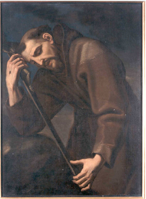 Personaggio maschile a mezza figura, di tre quarti, con il capo reclinato su un crocifisso, gomito destro appoggiato ad una roccia, stigmate visibili sulle mani.