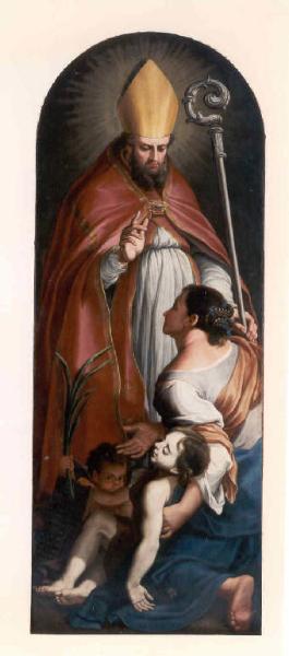 Vescovo con mitria e pastorale; in basso, angelo con in mano un ramo di palma e, di spalle inginocchiata, una donna reggente un bambino morto o moribondo.