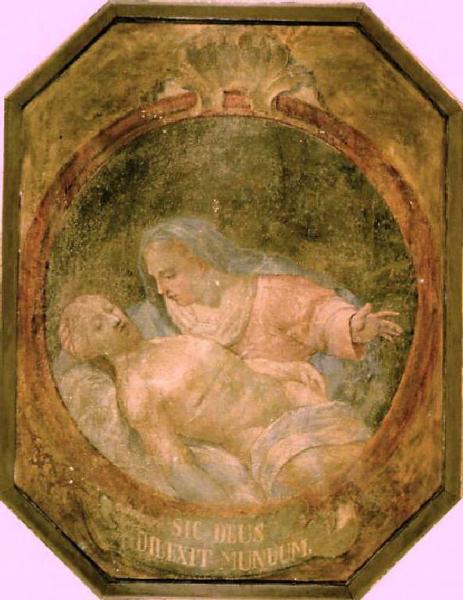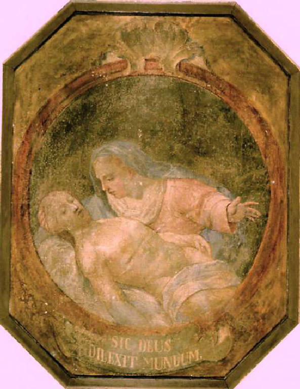 Il dipinto, di taglio ovale, rappresenta il Cristo morto disteso sulle gambe della Madre e appoggiato a un lenzuolo. La parte inferiore del corpo del Cristo non è visibile, il suo capo è appoggiato sa braccio della Madonna. Il corpo subisce una torsione ed è irrigidito dal rigore della morte. La Madonna spalanca il braccio sinistro e ha il volto reclinato verso quello del Figlio. Il fondale è scuro e neutro.