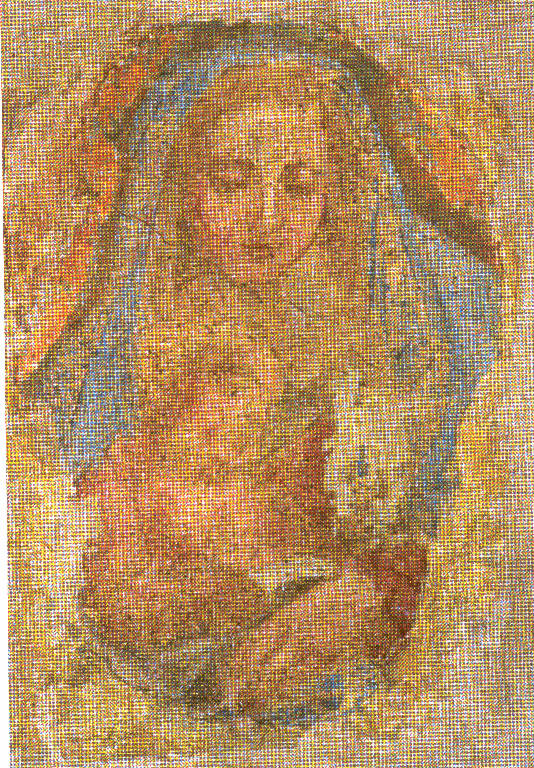 Madonna raffigurata frontalmente a mezzo busto, rivolge lo sguardo a Gesù Bambino addormentato stretto tra le braccia.