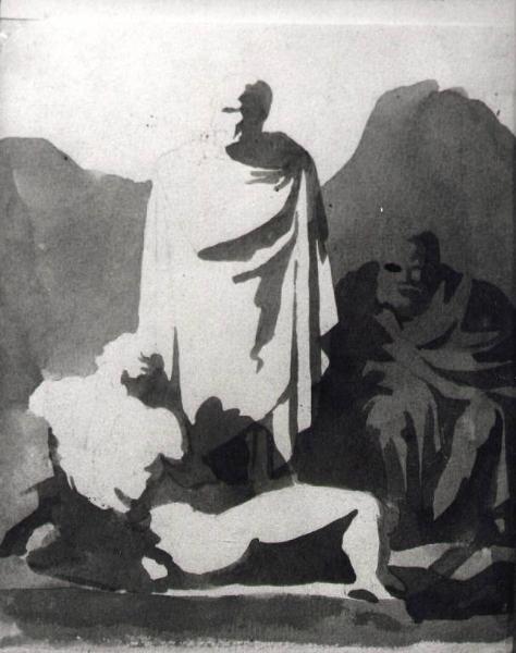 Al centro, una figura maschile panneggiata incombe su un uomo nudo semisdraiato e di spalle. Nell'ombra, un altro uomo panneggiato fissa il personaggio maschile sdraiato.