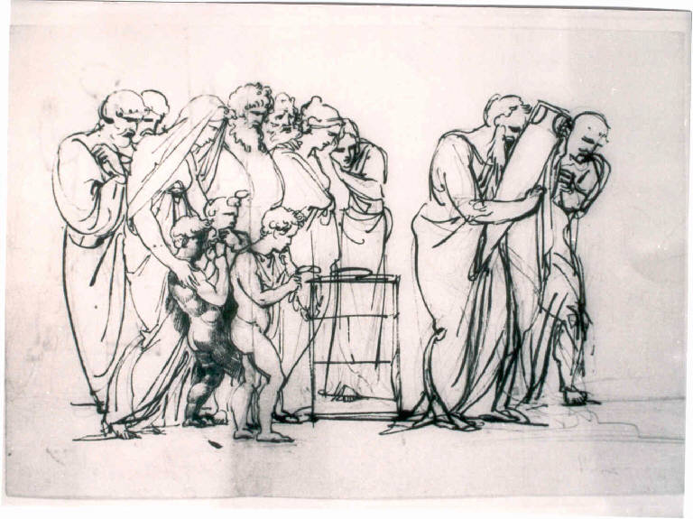 - NOTIZIE STORICO CRITICHE Il disegno è preparatorio ad un dipinto ad olio di analogo tema sito presso la Civica Galleria d'Arte Moderna di Milano.\nSul retro presenta studi di figure di soldati ignudi con elmo (penna, inchiostro, matita su carta bianca; firmato in alto al centro "Bossi").
