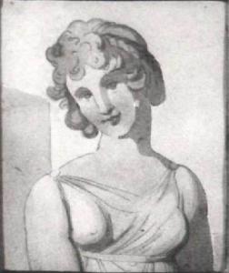 Figura femminile di giovane, raffigurata a mezzo busto frontalmente, con il capo leggermente inclinato.