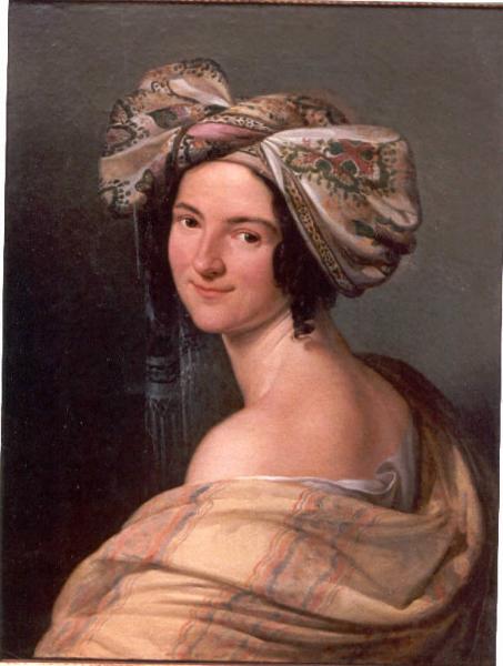 Ritratto di donna (Agnese Rusconi) raffigurata di tre quarti, di spalle, vestita all'orientale, con la veste che le lascia scoperta spalle e collo. Pettinatura definita a "l'anglais", con sciarpa annodata in testa a formare un turbante con fiocco. Sguardo fisso verso l'osservatore.