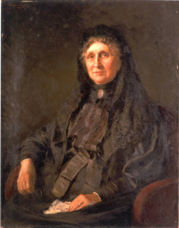 - NOTIZIE STORICO CRITICHE L'opera è in pendant col "Ritratto di nobiluomo": entrambe i dipinti raffigurano i genitori della signora Anna Schindler, seconda moglie del pittore Enrico Crespi. L'artista si distingueva come ritrattista tra le famiglie benestanti lombarde, mostrando particolare attenzione alla definizione dei dettagli e alla fisionomia dei personaggi, facendo anche uso del mezzo fotografico. La coppia di ritratti qui considerata è caratterizzata dalla scelta delle tinte quasi a monocromo, che mette in risalto i volti, i tratti fisionomici e la resa psicologica dei due coniugi (Isabella Marelli).