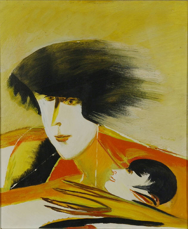 Figura femminile a mezzo busto con in braccio un bambino.