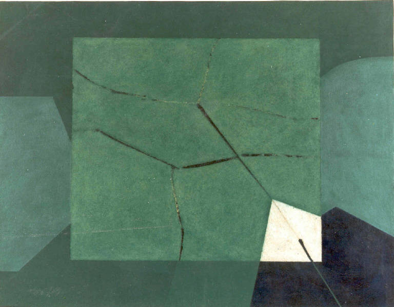 Sovrapposizione di figure geometriche sui toni del verde, del bianco e del nero.