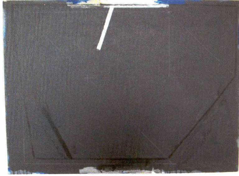 Campitura grigio scuro con linee nere e bianche ed accenni di pittura bianca e blu sul bordo superiore ed inferiore della tela.