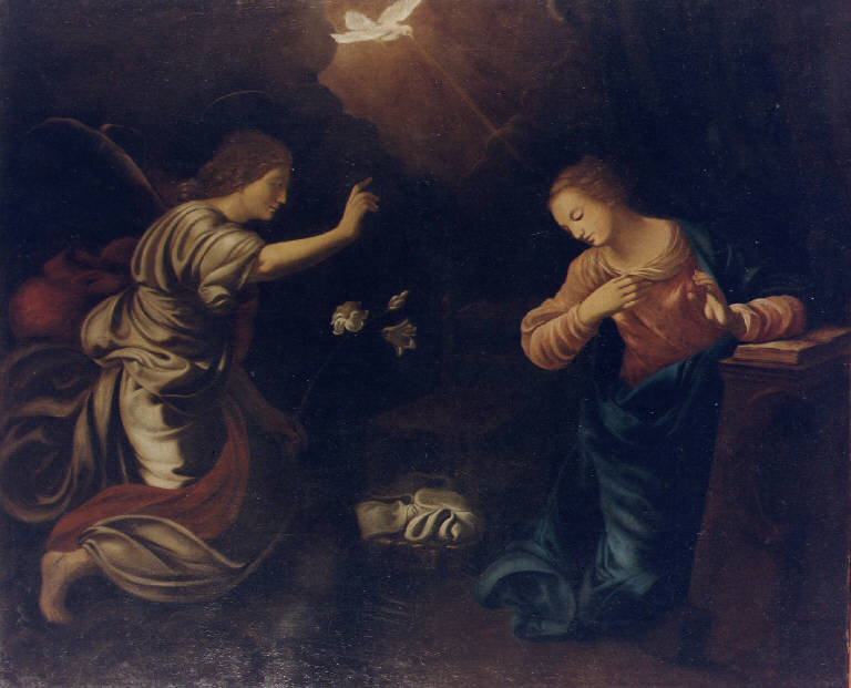La tela, di taglio orizzontale, rappresenta l'Arcangelo Gabriele in ginocchio di fronte a Maria Vergine, secondo il linguaggio dell'iconografia tradizionale. L'Arcangelo è raffigurato a sinistra, genuflesso con la mano destra alzata in segno benedicente, mentre nella sinistra regge il giglio simbolo di purezza. A destra la Vergine inginocchiata è colta nel momento della preghiera con il braccio sinistro appoggiato sul libro aperto sull'inginocchiatoio e la mano destra al petto. Il corpo è frontale e il volto è girato in ascolto verso l'Arcangelo. Al centro della composizione, in alto tra le nubi, la colomba divina dello Spirito Santo è dipinta in asse con la figura di Maria mentre a terra è raffigurata la cesta da lavoro della Madonna. L'illuminazione, che proviene dall'alto, colpisce il volto della Vergine e scolpisce il panneggio della veste angelica e del telo bianco nella cesta. Il fondale è immerso nell'oscurità.