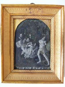 - NOTIZIE STORICO CRITICHE Lo smalto è montato entro una cornice di legno dorato decorata con foglie di gusto Neoclassico. Il Malaspina nel suo Catalogo del 1824 descrive l'opera come una "Pace in ismalto antico consimile al Niello [...]. Lo smalto è a chiar-oscuro con tinta alquanto cilestra, come praticossi talvolta nelle prime stampe, e come può osservarsi nel così detto giuoco del Mantegna". In stretta relazione con questa composizione è infatti un niello, sempre facente parte della collezione Malaspina (si veda la scheda relativa, inv. St. Mal. 5423). Paola Venturelli (2000, p. 586 e 2003) per prima portò l'attenzione sullo smalto e sul niello della collezione Malaspina, proponendo un'attribuzione all'ambito lombardo, sicuramente per lo smalto, e anche per il niello che, a suo parere, ne costituirebbe una derivazione. Risultando però questo smalto in controparte rispetto al niello, e quindi nello stesso verso della prova su carta, si potrebbe più semplicemente dedurre che sia stato lo smalto ad avere tratto ispirazione dalla composizione del niello, verosimilmente nota attraverso una prova su carta antica (se l'unica stampa nota oggi è da considerarsi moderna [si veda la scheda relativa, inv. St. Mal. 5455], si deve presupporre l'esistenza di un'altra prova antica, oggi perduta).\nLo smalto trova analogie con altri pezzi della produzione lombarda del XV secolo, indagata da Paola Venturelli (2000 e 2003), sia nella maniera di rendere le fisionomie, sia per i panneggi e la resa delle rocce del paesaggio in primo piano: gli influssi foppeschi e butinoniani trovano riscontro nel confronto con gli smalti della Passione di Cristo nel piede del tabernacolo donato nel 1495 dal vescovo Carlo Pallavicino alla cattedrale di Lodi (Museo Diocesano d'arte sacra), quelli dello Specchio della Regina Isabella (Granada, Cattedrale) e quello del medaglione con Episodi della Passione di Cristo (Madrid, collezione Valencia de D. Juan).\nPer la figura del San Sebastiano, in particolare, è stato rilevato dalla stessa studiosa un confronto diretto con una tavoletta (Bergamo, collezione privata) già attribuita Vincenzo Foppa, ma considerata oggi piuttosto un'eco dell'ascendenza foppesca.