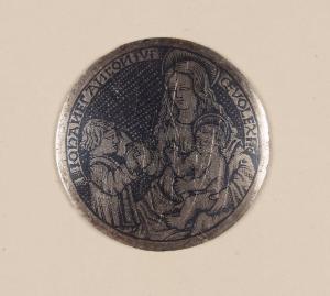 - NOTIZIE STORICO CRITICHE Il niello, conservato su un vassoio insieme ad altri pezzi e contrassegnato su di esso dal n. 32, è inserito dal Malaspina nel suo Catalogo del 1824 tra quelli "de' bassi tempi", perlopiù di forma tonda e di soggetto sacro, che andavano originariamente a decorare oreficerie liturgiche. La composizione, secondo il marchese Malaspina, raffigurerebbe "un religioso che riceve dalla Vergine una carta, forse le regole di un Ordine religioso". L'iscrizione sembra riferirsi al nome di un committente: forse il devoto inginocchiato?\nSulla base di analogie tecniche e stilistiche, questo niello potrebbe avvicinarsi ad un altro della stessa collezione (cfr. inv. St. Mal. 5401): entrambi, tra l'altro di dimensioni più grandi del solito, andavano probabilmente a decorare un medesimo oggetto sacro.