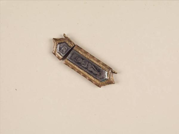 - NOTIZIE STORICO CRITICHE L'oggetto è probabilmente un portaspilli, conservato su un vassoio insieme ad altri pezzi niellati e contrassegnato su di esso dal n. 39; è inserito dal Malaspina nel suo Catalogo del 1824, tra i nielli 'dei bei tempi', descritto come un "piccolo astuccio di metallo ad uso di donna con lastre niellate da due parti, entro cui sonovi rappresentati de' belli amorini o genietti".
