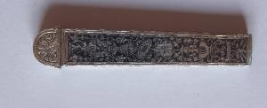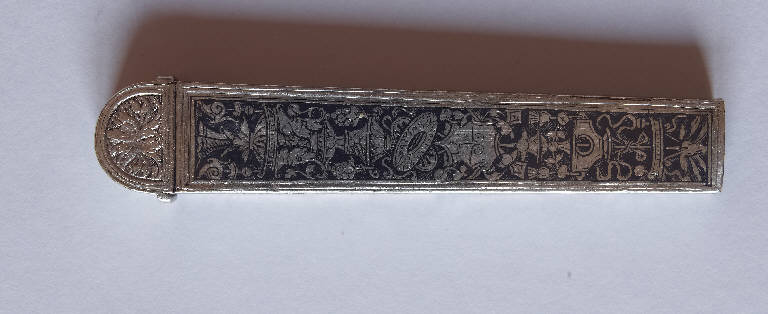 - NOTIZIE STORICO CRITICHE Si tratta di un manico di coltello costituito da quattro lastrine niellate, decorate simmetricamente: le due poste lungo lo spessore presentano una semplice decorazione a intreccio; le due lastrine maggiori presentano una decorazione a grottesche, con elementi desunti dal mondo militare, come trofei, scudi, insegne, etc. \nE' conservato su un vassoio insieme ad altri pezzi niellati e contrassegnato su di esso dal n. 54; è inserito dal Malaspina nel suo Catalogo del 1824 insieme agli altri tre manici analogamente decorati in maniera che il marchese descrive come "alla raffaellesca".