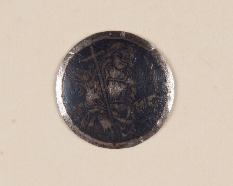 - NOTIZIE STORICO CRITICHE Il niello, conservato su un vassoio insieme ad altri pezzi (e contrassegnato dal n. 47), è inserito dal Malaspina nel suo Catalogo del 1824 tra quelli "de' bassi tempi", perlopiù di forma tonda e di soggetto sacro, che andavano originariamente a decorare oreficerie liturgiche. Dato anche lo stato di conservazione, è difficile capire se il niello raffiguri un santo o una santa. Secondo la possibile identificazione con uno dei nielli descritti da Duchesne, potrebbe trattarsi di San Filippo.