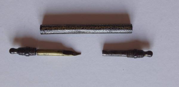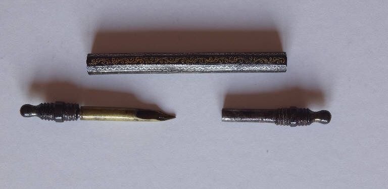 - NOTIZIE STORICO CRITICHE Questo oggetto è allo stesso tempo un porta penna stilografica e, come indicato anche nel Catalogo del marchese Malaspina del 1824, "porta-lapis di finissimo ornato". E' conservato su un vassoio che porta altri pezzi che il marchese Malaspina riteneva realizzati con la tecnica dell'agemina (si vedano gli altri pezzi, inv. St. Mal. 5369-5384).\nE' difficile stabilire una datazione: sulla base dell'osservazione della tipologia decorativa, che mostra anche una dama, potrebbe facilmente trattarsi di manifattura sette-ottocentesca.