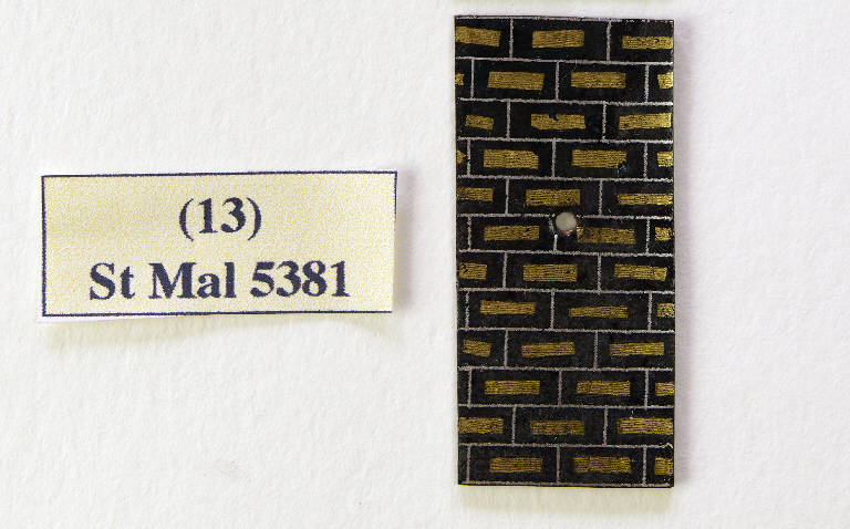 - NOTIZIE STORICO CRITICHE Questa lastrina è conservata su un vassoio che porta altri pezzi di analoga fattura, che il marchese Malaspina riteneva realizzati con la tecnica dell'agemina e destinati a decorare oggetti non meglio identificati (si vedano gli altri pezzi, inv. St. Mal. 5369-5384). Questa lastrina in particolare è simile ad un'altra (inv. St. Mal. 5380): il foro visibile era appunto destinato a fissare il pezzo ad un'altra superficie. Potrebbe anche darsi che i pezzi derivino tutti da un medesimo oggetto smontato (magari una scatola?). \nE' difficile stabilire una datazione, potrebbe anche trattarsi di manifattura sette-ottocentesca.
