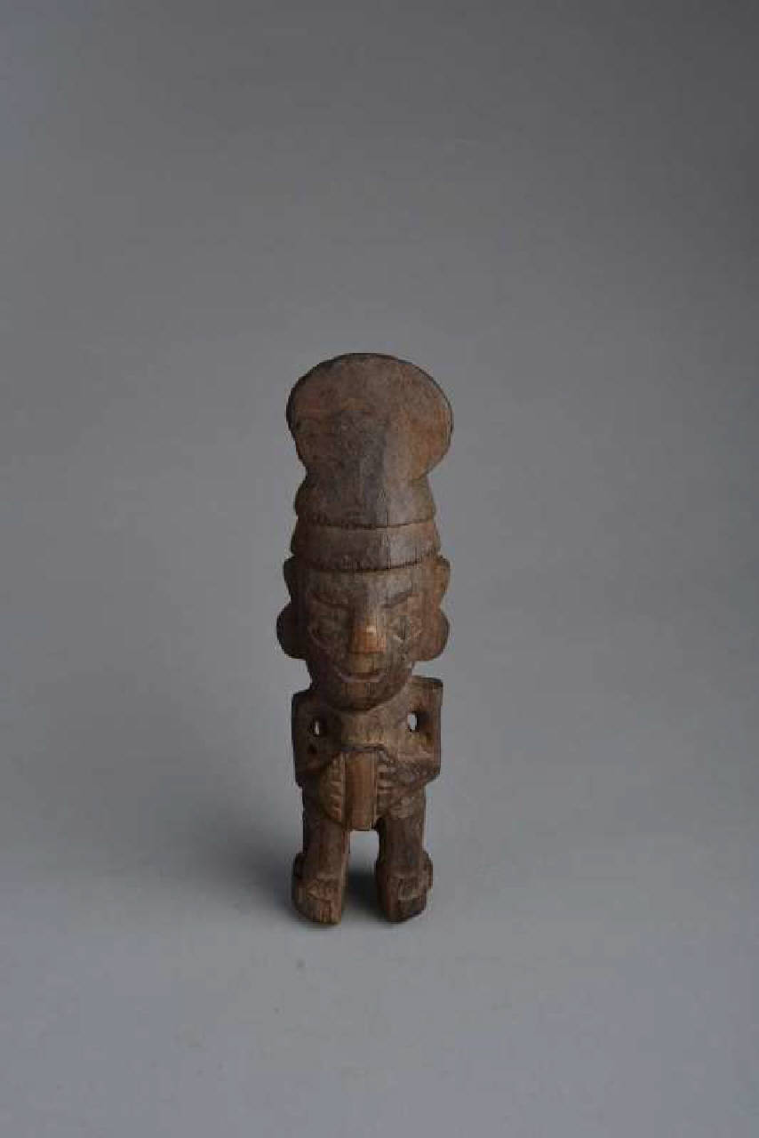 Statuina in legno raffigurante un personaggio maschile seduto su uno sgabello, con copricapo semilunato e due orecchini, che tiene gli avambracci appoggiati alle cosce e regge un bicchiere tra le mani.