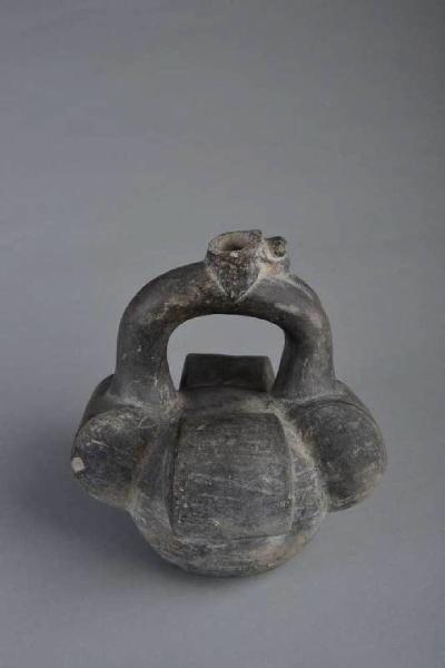 Bottiglia con camera globulare con quattro protuberanze semicilindriche (frutta ?), base piana circolare, superiormente un' ansa a staffa a sezione circolare con versatoio cilindrico di cui è rimasta solo la parte iniziale. Impasto di color grigio, ingobbio di color nero. La bottiglia presenta una scimmietta tra l'ansa e il versatoio.