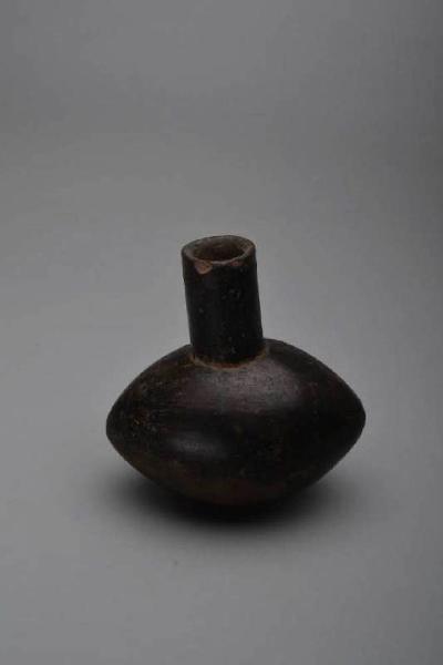 Bottiglia fitomorfa con camera ovoidale, superiormente un versatoio cilindrico, lateralmente un' ansa nastriforme. Impasto di color grigio, ingobbio di colore nero.
