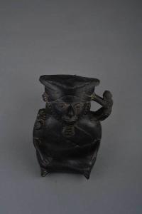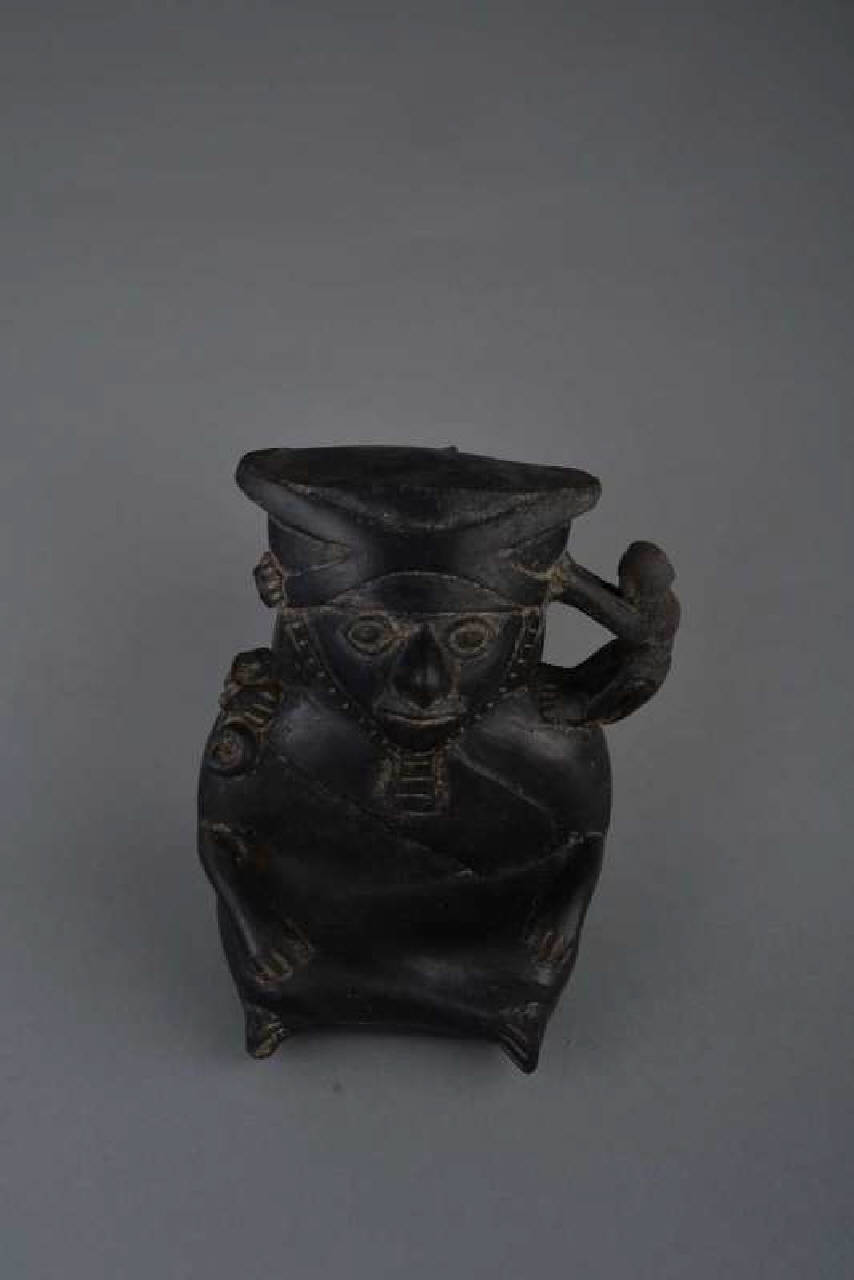 Frammento di bottiglia con due camere di cui una mancante, unite da un raccordo ventrale cilindrico e da un manico a ponte nastriforme; la camera mancante, forse a forma globulare, era sormontata da un versatoio cilindrico, l' altra è antropomorfa a base piana. Impasto fine di colore grigio, ingobbio di colore nero. La bottiglia, nella parte intatta, rappresenta una figura maschile seduta a gamba incrociate con gli avambracci appoggiati lungo le cosce. Il personaggio indossa un copricapo legato sotto il mento ed una tunica con banda obliqua che termina sulla schiena con una sorta di pendaglio, reca una scimmia con cintura su una spalla mentre sull'altra ci sono i frammenti di una seconda scimmia.