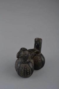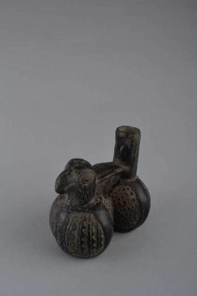 Vaso in terracotta con due camere globulari a base piana ellittica e raccordo ventrale, superiormente una testa d' uccello (cormorano ?) e un versatoio cilindrico uniti da un manico a ponte nastriforme. Impasto di colore grigio, ingobbio di colore nero. Cottura riducente. Esecuzione a stampo verticale. Le camere del vaso decorate a stampaggio con motivi a pelle d' oca e dentellati, sono divise in quattroparti uguali dalle linee di saldatura dello stampo e rifinite secondo larghe strisce verticali.