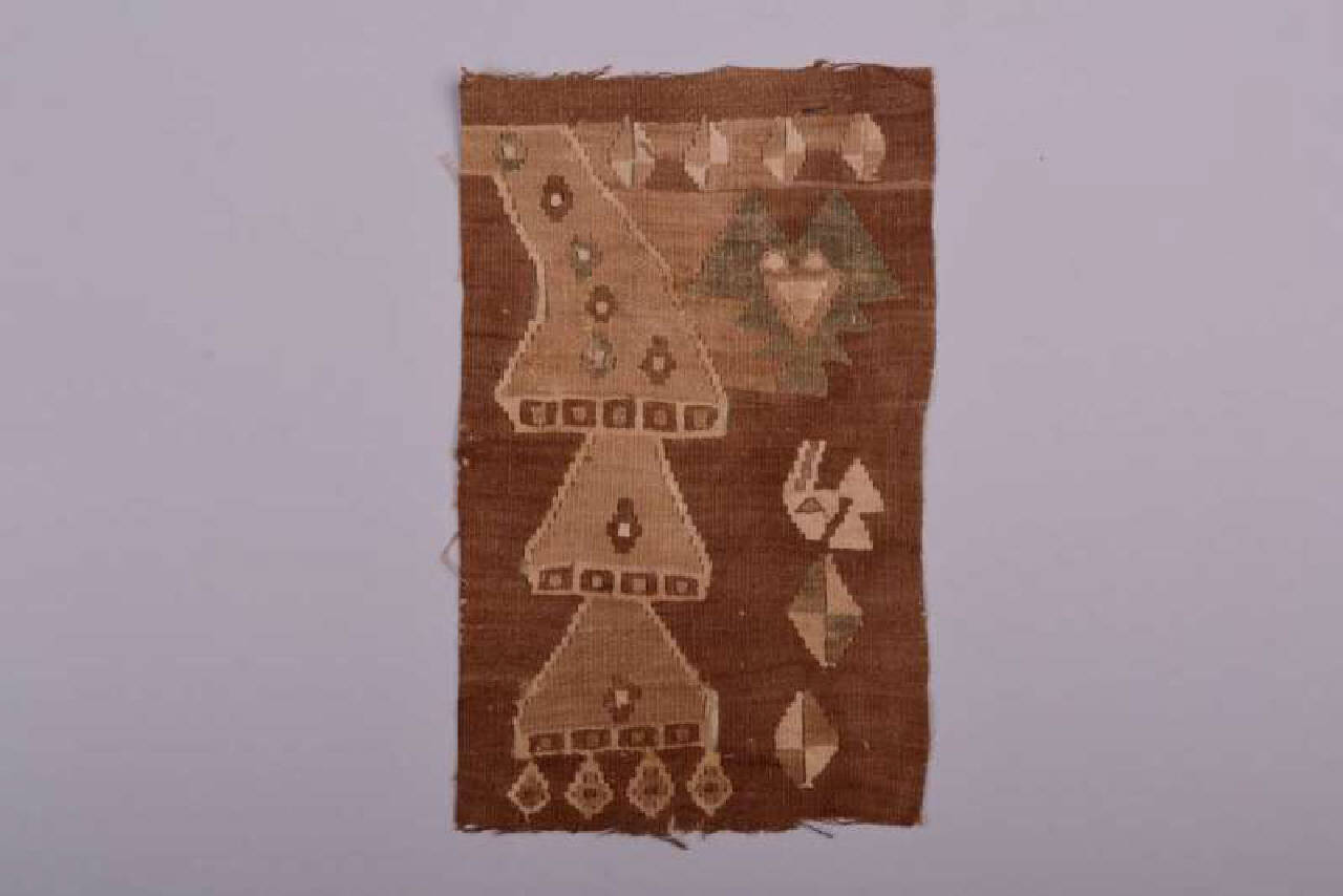 Frammento rettangolare di tessuto in lana color nocciola con ampi elementi decorativi geometrici di color nocciola più chiari e verde azzurrognolo.