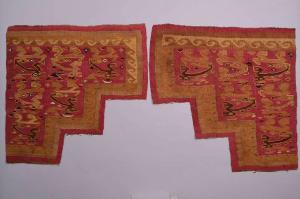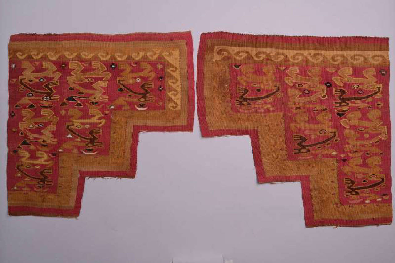 Frammento di bordura di camicia o perizoma. Due zone terminali bordate in rosso di un manto da guerriero a decorazione gialla, bruna e nera raffigurante giaguari stilizzati su fondo rosso entro bordura ad ornati gialli.