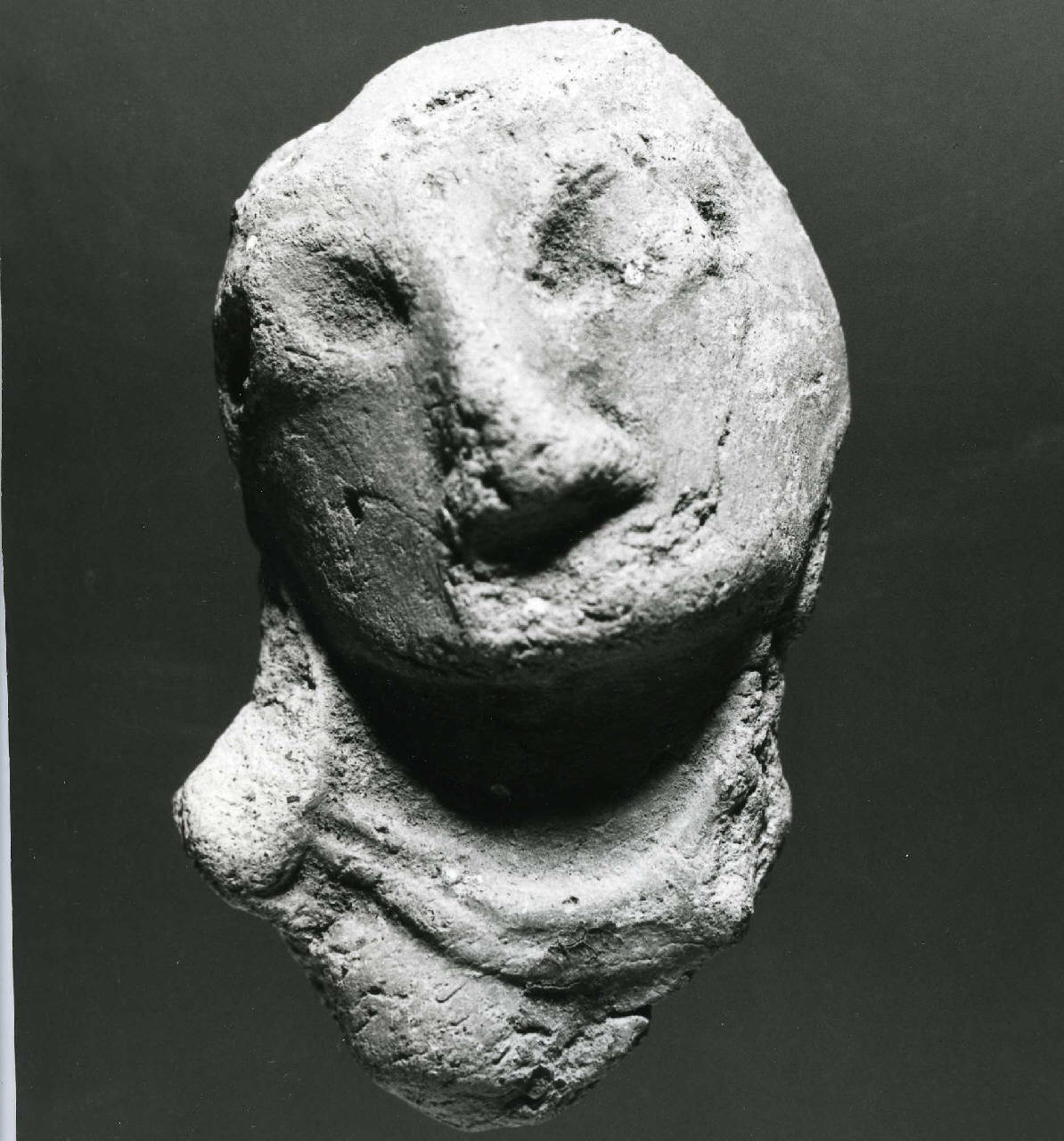 Testina di figurina fittile con naso modellato e parte di collana. Impasto colore marrone chiaro.